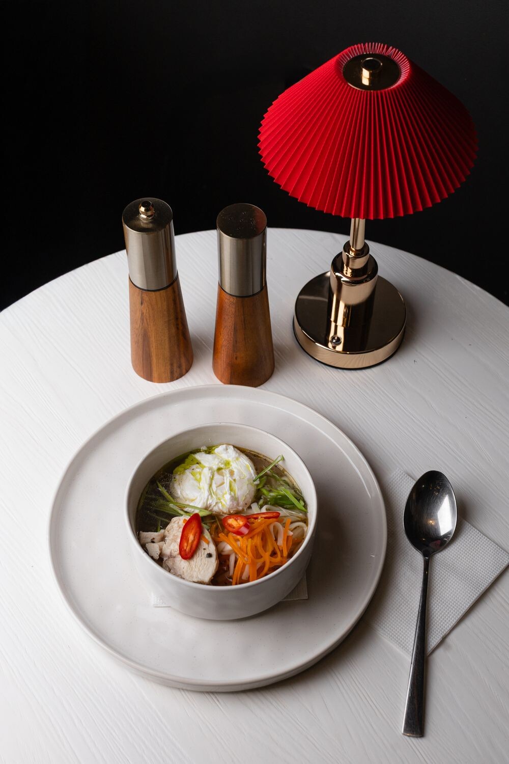 Куриное филе, лапша удон, морковь, зеленый лук, чеснок, яйцо-пашот, кунжутное масло, соус соевый, перец чили