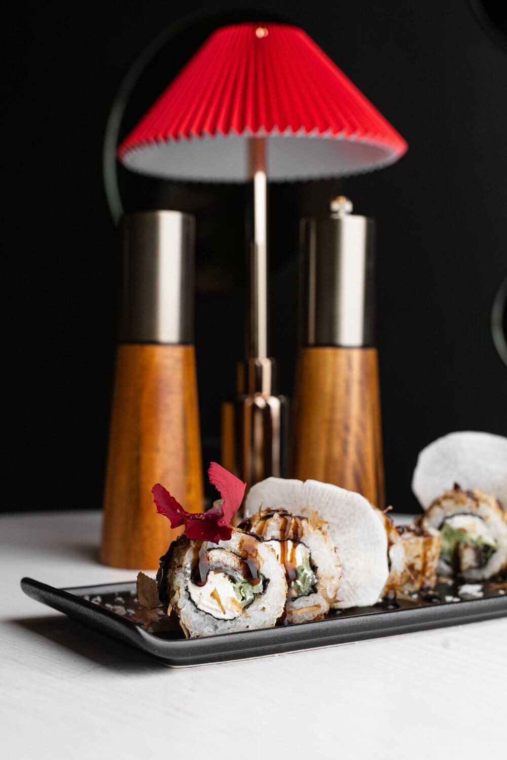 Рис, водоросли нори, сыр творожный, огурец свежий, угорь жареный, стружка тунца бонито, соус унаги, дайкон, вассаби