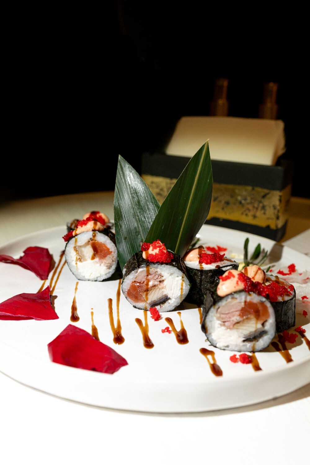 Рис, водосли нори, сыр творожный, лосось с/с, тунец филе, угорь жареный, соус унаги, соус спайси, икра тобико