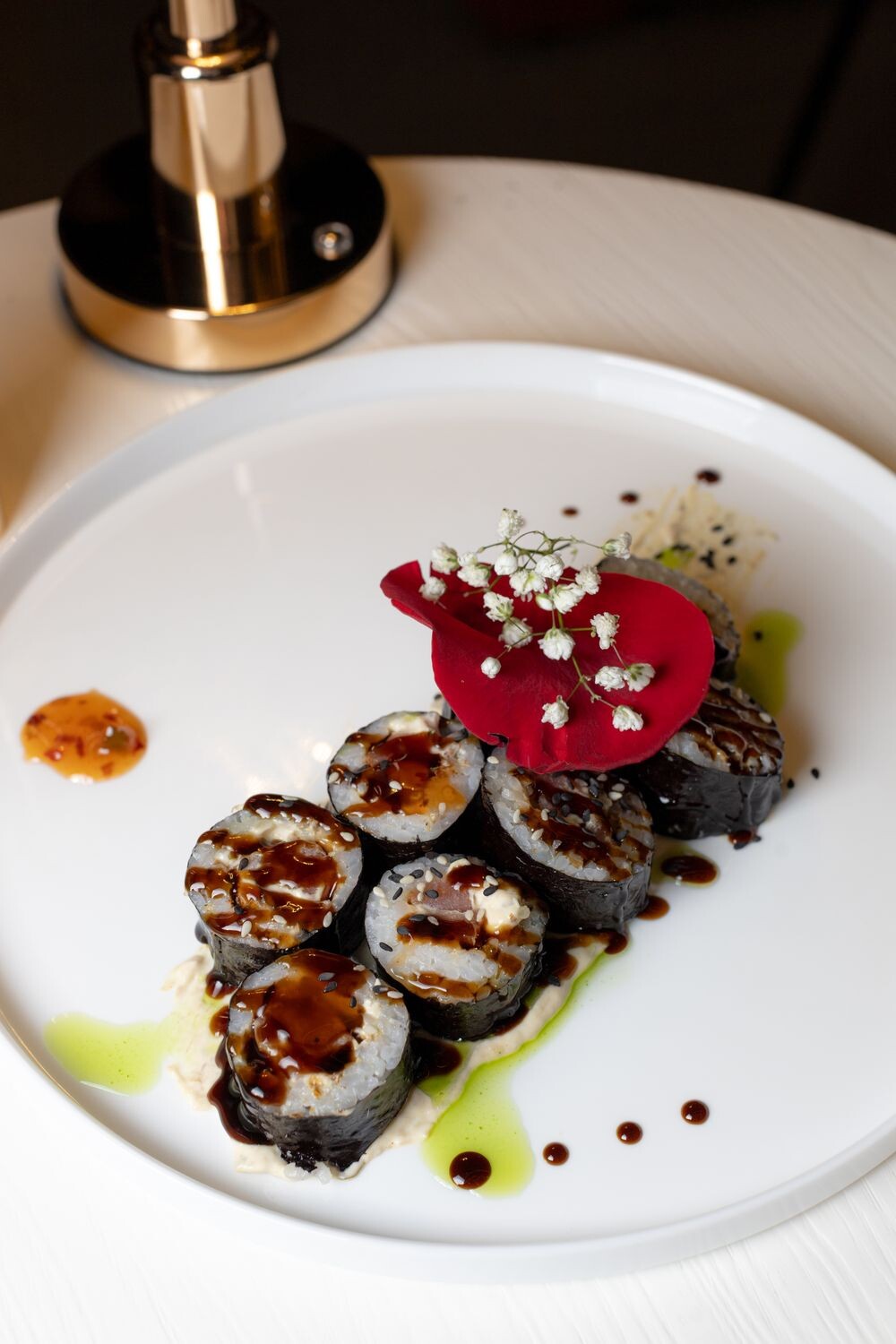 Рис, водоросли нори, тунец филе, соус виттело тоннато, соус сладкий чили, стружка тунца бонито, кунжут