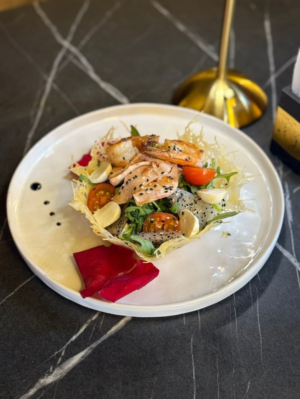 Салат айсберг, руккола, креветки, грудка копченая, томаты черри, сыр пармезан, питахайя свежая, соус азиатский, кунжут белый