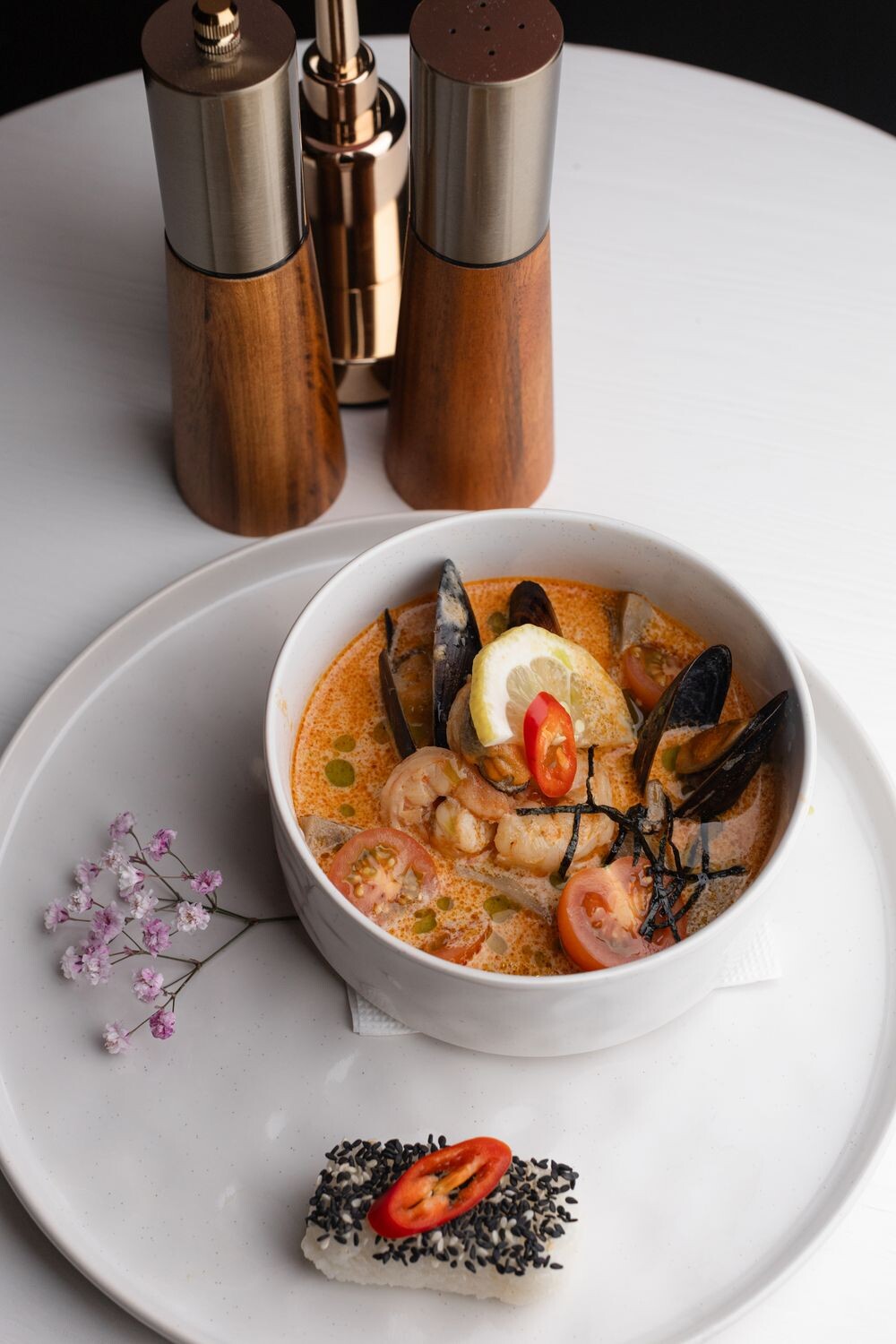 Куриный бульон, мидии, мидии в створках, креветки, шампиньоны, лимон, острый перец, лук зеленый, имбирь, томаты черри, сливки, паста том ям, рыбный соус, соус чили, рис, кунжут микс